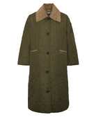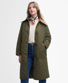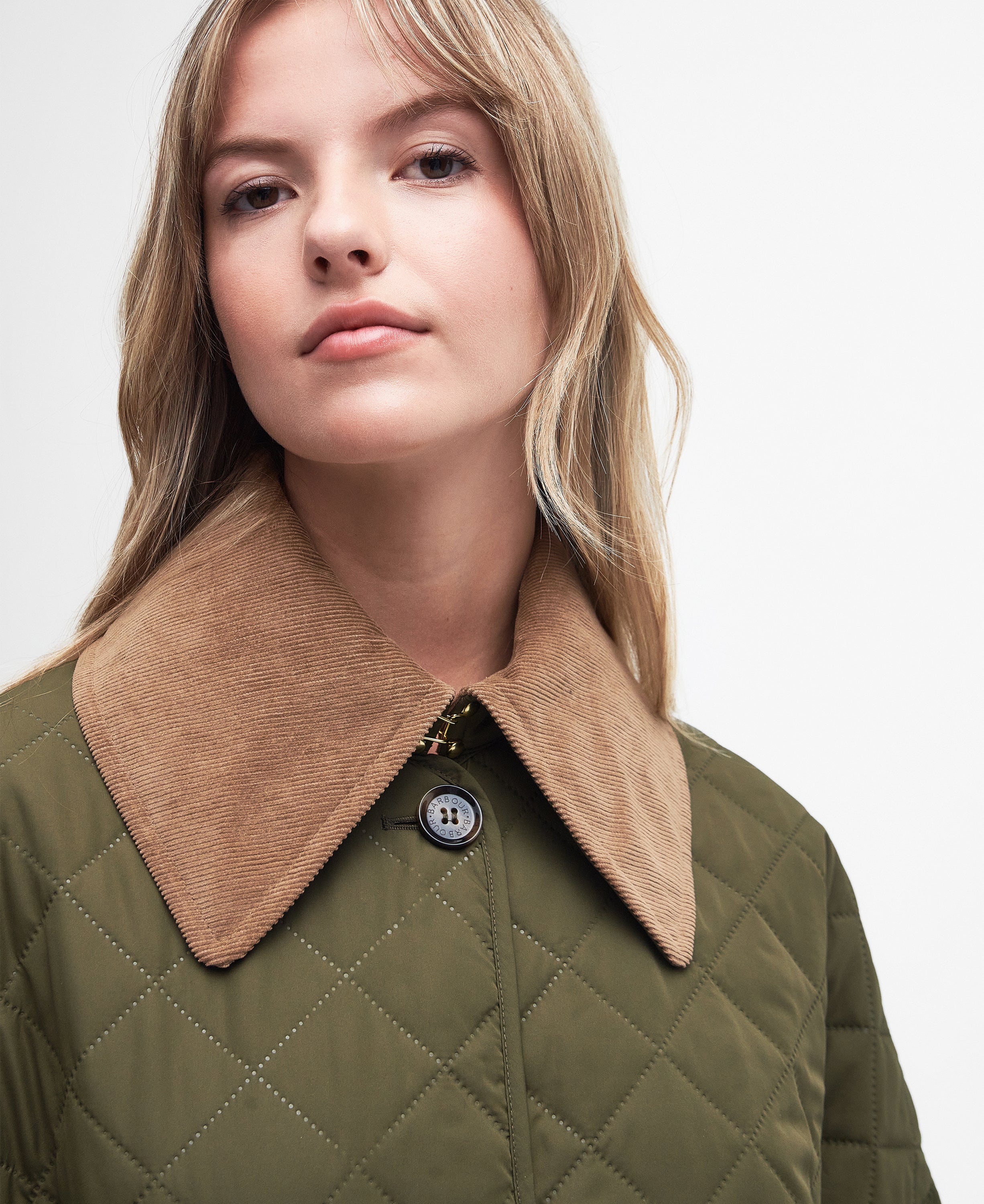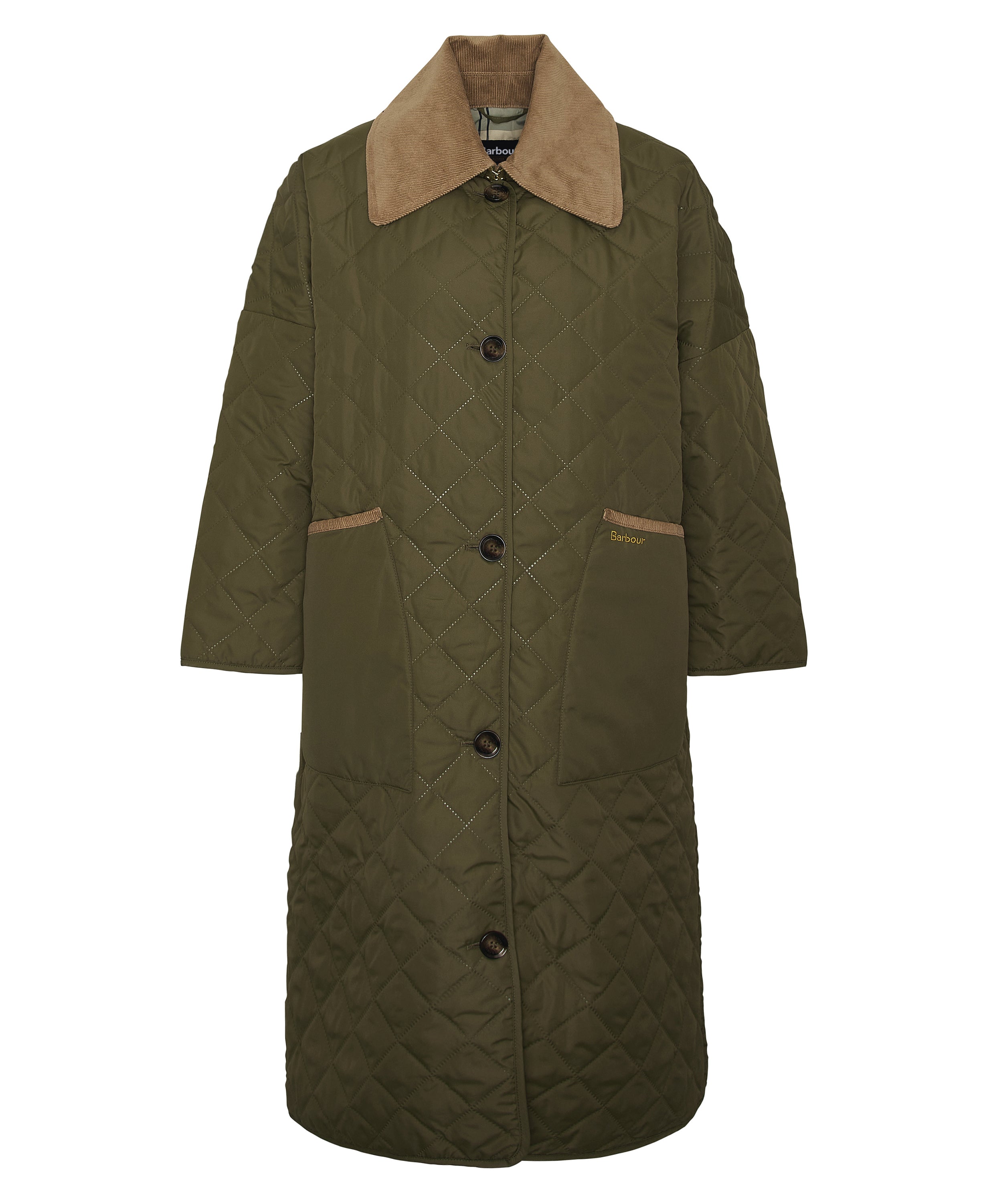 Su silueta estilizada incluye un cuello alto para mayor protección, cierre frontal con cremallera bidireccional y solapa de broches, así como dos bolsillos laterales que aportan practicidad. El detalle de la insignia Barbour en la manga le da un acabado auténtico y distinguido.